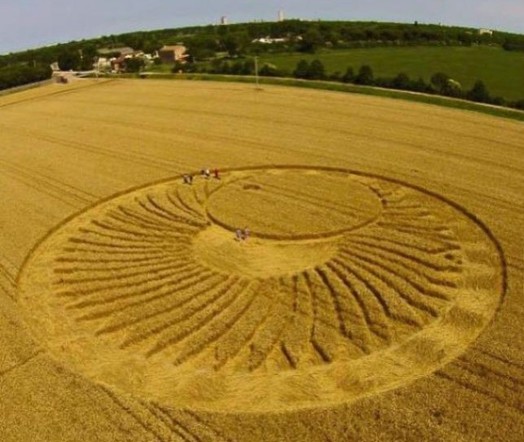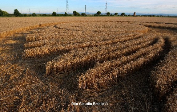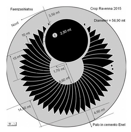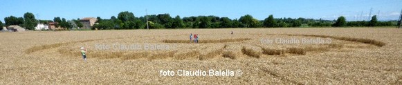 Dopo vario tempo ecco un nuovo cerchio nel grano da me visitato in questi giorni. Risulta che sabato 20 giugno 2015 notte sia stato realizzato. Io ne ho avuto notizia da un amico martedì 23 e si è potuti andare a vederlo solo mercoledì 24. Visitato una seconda volta il 25. Malgrado l'alto numero di persone che lo avevano visitato era ancora in buono stato. La figura sembra riprodurre almeno un Sole ed uno spicchio di Luna, vari raggi solari ed un piccolo cerchio con nido all'interno del cerchio principale. I nidi con vortice intorno erano in totale 16 di cui 14 sul bordo e due ad indicare il centro e quello dentro il cerchio piccolo di circa 1,5mt. Il diametro complessivo l'ho stimato in circa 56mt. Un rilievo con magnetometro non ha dato risultati. Personalmente non ho notato spighe "piegate" nei punti dei nodi delle piante di grano. Alcune abbastanza visibili imperfezioni mi fanno ritenere che ci sia la mano dell'uomo in questo crop anche se ho notato una discreta cura, malgrado il calpestio, nella piegatura delle spighe in varie direzioni come alcune altre che considero imperfette. A meno che qualche importante esperto non valuti il disegno secondo particolari aspetti astronomici o predittivi di cui non sono a conoscenza, la mia tendenza è di considerarlo un falso umano seppur ben fatto. Solo determinati esami e rilievi (che per un privato hanno un certo costo) possono aggiungere tessere sulla veridicità del pittogramma e ne sarei contento visto che non sono certamente contrario alla origine "aliena" dei crop circle.