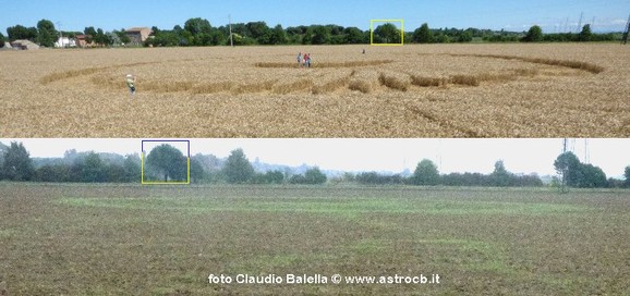Ho ricevuto da un'amica notizie e foto del terreno dov'era il crop perchè con stupore ha visto un cerchio di erba ricresciuto ! Stupito sono andato a rivedere il luogo ed ho fatto foto. Nella zona del crop c'era ben visibile un cerchio di erba verde con verde anche all'interno. Non mi è stato possibile andarci vicino perchè il terreno era inzuppato dalla pioggia caduta nella notte fino a poco prima. La foto odierna l'ho scattata quasi nella stessa posizione in cui ho scattato quella di giugno. Guardando la foto sotto in cui ho mantenute le stesse proporzioni, ho segnato con un rettangolo lo stesso albero nelle due foto, si nota poi chiaramente che il diametro è lo stesso e che all'interno vi è erba al posto del cerchio interno estivo. Capita che cropo circle conservino "forme di energia" che fan ricrescere piante con forma simile e quando accade non è per il frutto di uno scherzo ma è da annoverare fra quelli veri, realizzati da qualche altro essere che vuol comunicarci qualcosa. Pare proprio che dobbiamo ricrederci dopo 4 mesi. Non si impara mai abbastanza.