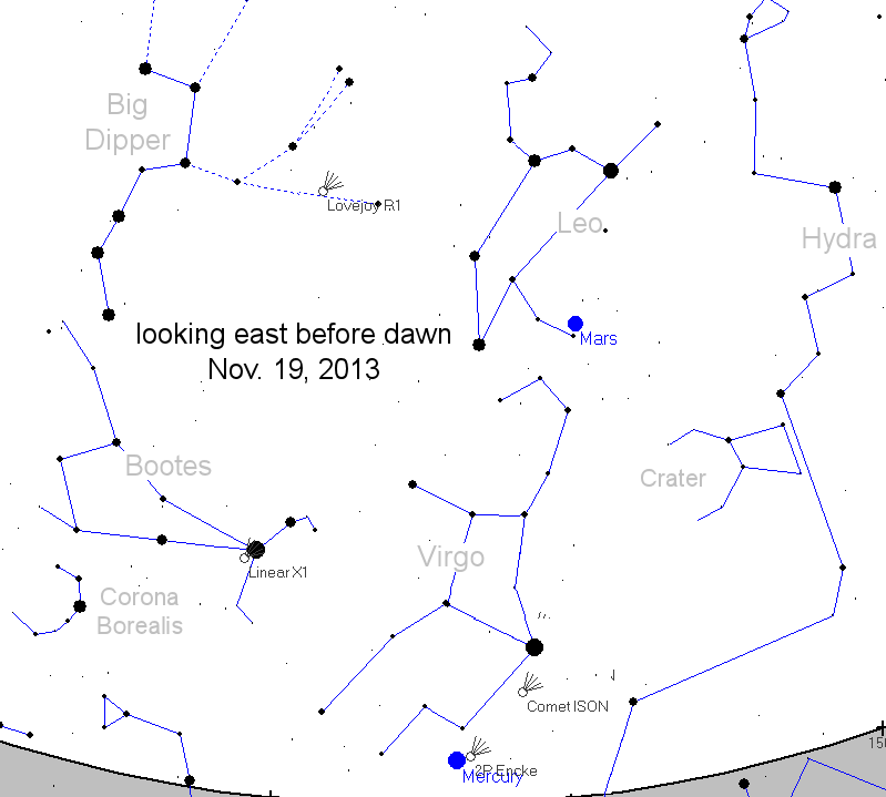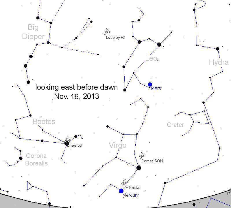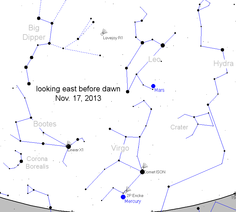 La mappa è alle ore 5.15 del mattino ad est e la Ison ogni giorno successivo si avvicinerà al Sole