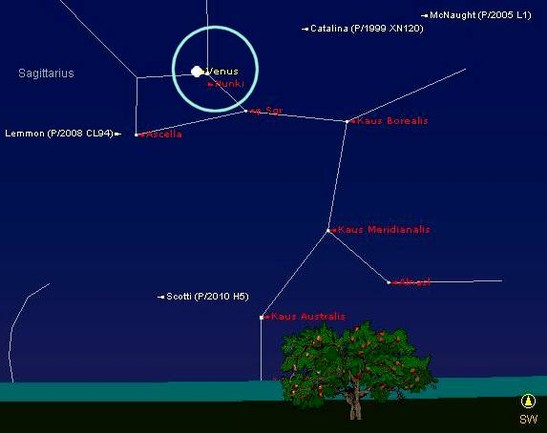 visibile al binocolo fra le 1930 e le 20 bassi al'orizzonte ovest.Non facile ma da non perdere.