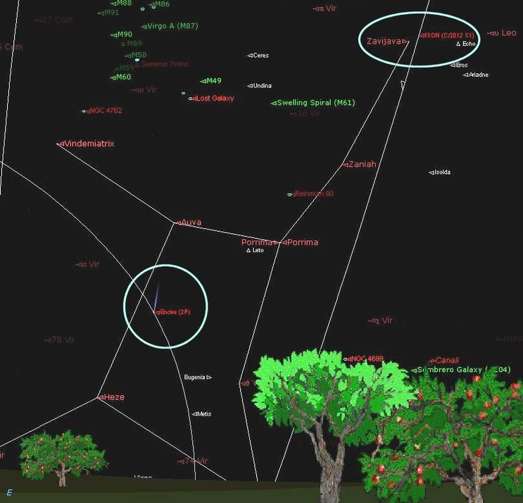 dovrebbe divenire abbastanza visibile per osservarla al binocolo essendo di 7° magnitudine. Questo giorno la Ison è facile da trovare perchè vicina a Zavijava stella della Vergine come in mappa.