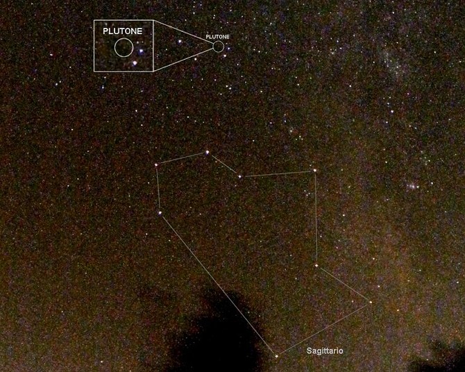 Il 15 luglio il giorno dopo il passaggio ravvicinato della sonda Nasa New Horizons a soli 13728km da Plutone ho ripreso questa immagine a grande campo della Via Lattea in cui si può vedere,debole, il puntino di Plutone dentro il cerchietto ed anche ingrandito. Non era l'obbiettivo giusto per riprendere Plutone ma è un bel ricordo. Dopo decenni una sonda umana è giunta a 4,5 miliardi di km da noi. Fantastico. Canon 600D 150715