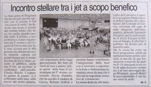 Una serata astronomica e benefica in un ambiente affascinante grazie alla grande disponibilità del Comando del 5° Stormo, delle Associazioni del Volontariato e dei Quartieri. Hanno parteciparto fra 400 e 500 persone !!! Un successone !!!