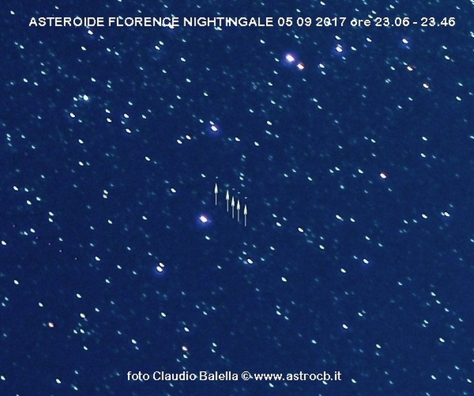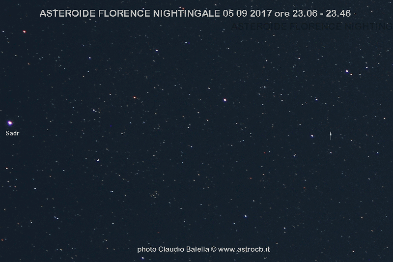 L'asteroide 3122 ha una dimensione stimata di 4,3 km ed è dedicato a Florence Nightingale fondatrice delle infermiere in ambito militare di guerra. Il 1° settembre è transitato a soli, si fa per dire, 7 milioni di km dalla Terra ed è uno degli asteroidi a rischio di impatto sul nostro pianeta ma ormai si sta allontanando quindi il problema si presenterà fra 483 anni in occasione del prossimo passaggio. Visibile al telescopio ed in fotografia l'ho catturato nella costellazione del Cigno vicino alla stella Sadr. L'animazione delle 6 foto fatte mostra con le frecce il suo veloce movimento in cielo. Canon 600D obb. 70mm e Astrotrack.
