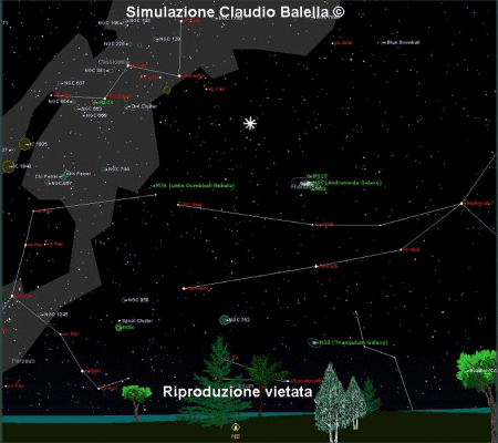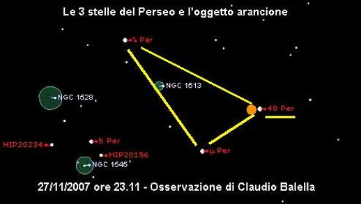 La sera del 24/11/07 ero in terrazzo, dotato di un binocolo stabilizzato Canon 15x50, per cercare di vedere la cometa Holmes visibile in questo periodo, una sorta di piccola sfida osservativa per la presenza della Luna piena, un pò di foschia e nubi alte e sottili. Non ho visto la cometa ma alle ore 23.11 notavo un punto luminoso giallo-arancio di magnitudine stimata fra la 0 e la +1, in lento movimento da nord-est a sud-ovest, talmente lento da non sembrare per nulla un satellite, percorrendo circa 8-10 gradi di cielo, quasi sulla verticale, in più di 1 minuto (un satellite artificiale impiega 4- 5 minuti a percorre tutta la sfera celeste di 180 gradi). All'osservazione al binocolo stabilizzato, che produce un'immagine molto ferma, lo si vedeva transitare a velocità nettamente variabile con sullo sfondo piccole stelline che ne confermavano il moto finchè ha rallentato sino a fermarsi e sono sicuro di questo perchè sullo sfondo vi erano 3 stelle poste a triangolo isoscele e quasi della stessa luminosità. Durante l'osservazione ho verificato che la messa a fuoco del binocolo sulla Luna faceva capire che il punto era più vicino della Luna a noi. L'oggetto è rimasto fermo per circa 30 secondi poi ho guardato l'orologio e subito dopo quando l'ho ricercato, ad occhio nudo e col binocolo, era scomparso. Ho fatto una ricerca con un software astronomico e ritengo che le 3 stelle sullo sfondo fossero Lambda Persei, Mu Persei e 48 Persei e l'oggetto si è fermato sopra 48 Persei. E' possibile che le stelle non siano quelle ma lo ritengo difficile perchè la forma a triangolo isoscele in quel modo inclinato e di quella dimensione e pari luminosità coincide col campo visivo del binocolo. Questi sono i fatti, l'oggetto (perchè di tale si tratta) era chiaramente tecnologico e con moto autonomo e non era proprio un satellite.