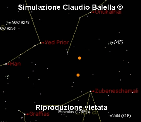 Una serata dedicata all'osservazione di Marte si è tramutata in una bella esperienza. Circa due ore prima mi era stata fatta una battuta sulla vicinanza degli "altri" a cui non avevo fatto caso. Sento il rombo di vari aerei militari e li vedo mentre solcano il cielo a forte velocità nel corso di vari minuti e mi stupisco di tutta questa attività. Improvvisamente guardo verso la Luna e vedo 2 oggetti luminosi rosso-arancio fermi grandi tre volte Marte che ho nel campo visivo e circondati da spessi raggi dello stesso colore disposti con precisione. Erano le 22.55. Dopo pochi secondi gli oggetti si spengono improvvisamente e guardando fra Marte e Saturno vedo un piccolo punto rosso-arancio che si muove in modo irregolare sparendo alla mia vista presumo per la distanza. Da quel momento il silenzio si è impadronito del cielo, oggetti e aerei sono scomparsi. Durante l'avvistamento la contemporanea osservazione della raggiera di Marte, irregolare e variabile dovuta all'atmosfera, mi ha confermato che quelle dei due oggetti avevano altra origine e non erano dovute all'atmosfera. Un bell' avvistamento di ufo peraltro annunciatomi casualmente. Nessun oggetto volante umano ha queste caratteristiche. Se siete negazionisti e vi capitasse di fare un avvistamento cambieretse in fretta idea credetemi...